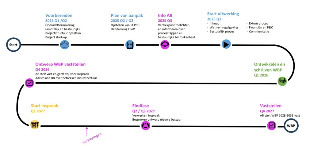 Het waterschap is in 2025 al begonnen met de voorbereidingen. In de eerste maanden van 2026 halen we zoveel mogelijk informatie op. Dat doen we binnen het waterschap en daarnaast gaan we ook in gesprek met medeoverheden en belanghebbende partijen. In de zomer van 2026 schrijven we het ontwerp Waterbeheerprogramma. Dat kan dan begin 2027 de inspraak in. Uiteindelijk stelt het algemeen bestuur eind 2027 het nieuwe WBP vast.