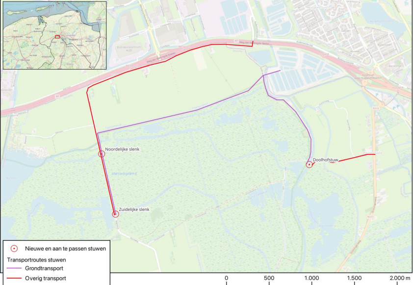 Op het kaartje hieronder zijn de transportroutes aangegeven. Er rijden vrachtwagens via de Hooiweg/Matsloot (de rode lijn) met materialen voor de aanleg van de stuwen. Het grondtransport gaat via het pad langs Cosun en de Roderwolderdijk (paarse lijn).